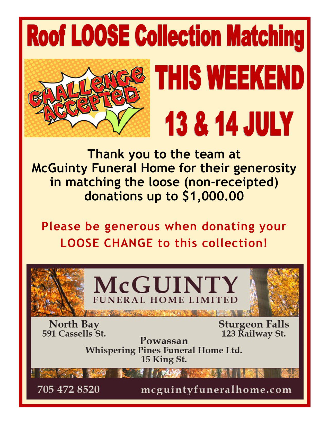 This is a Loose Roof Collection Matching Weekend! Thank you to McGuinty Funeral Home!