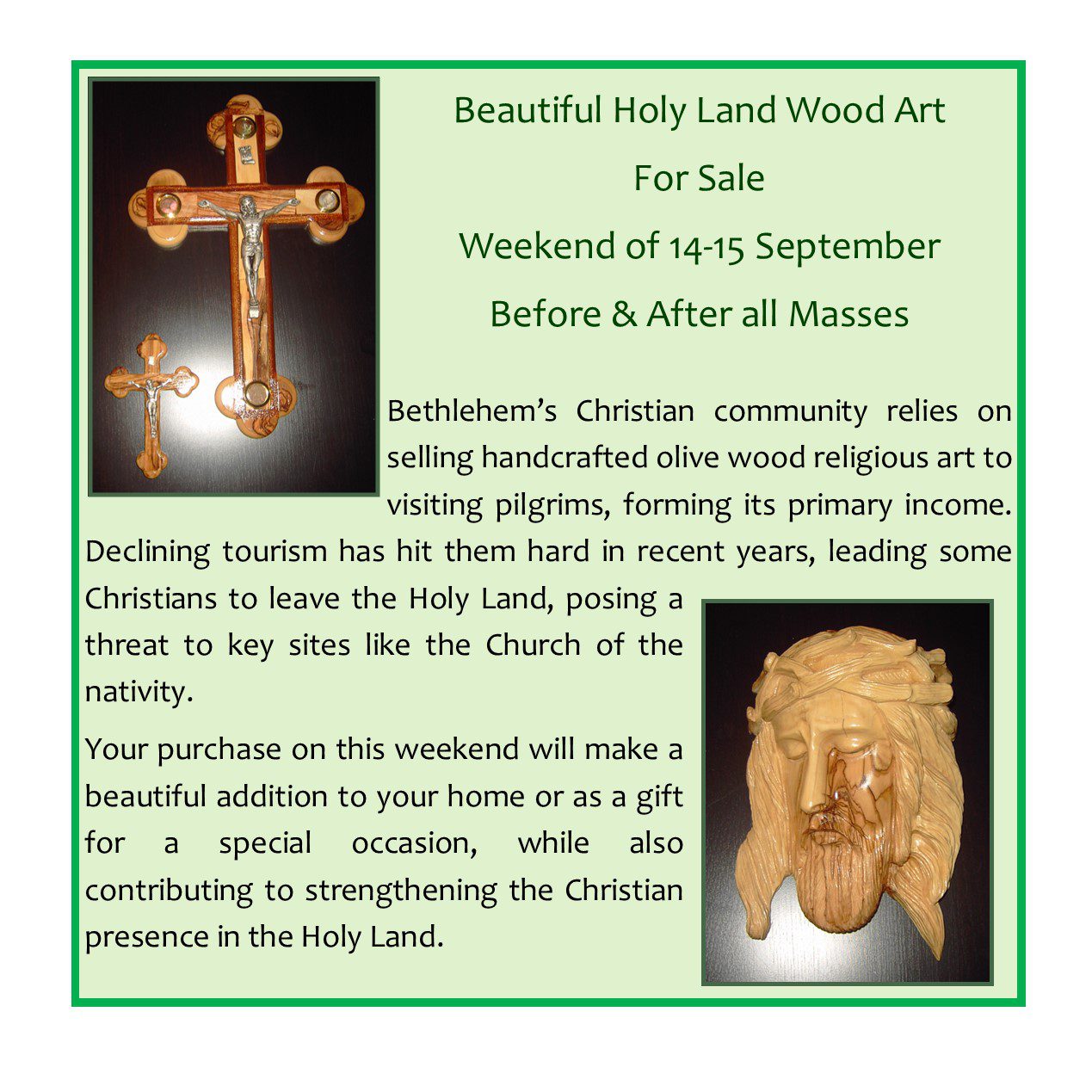 Holy Land Wood Art for Sale Next Weekend Before and After all Masses – In Support of the Holy Land
