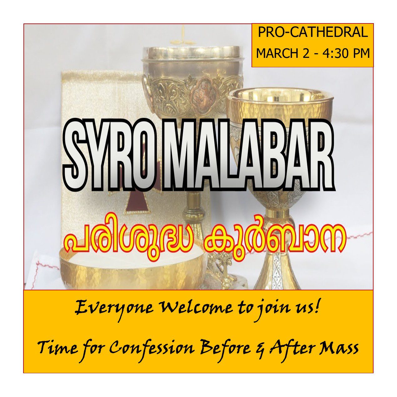 Saturday 4:00 PM (Confessions from 3:00 PM to 3:45 PM) Cathedral doors open at 2:30 PM