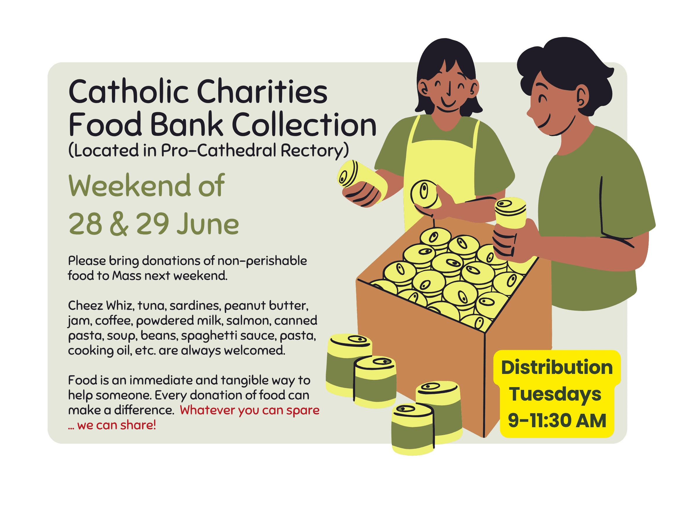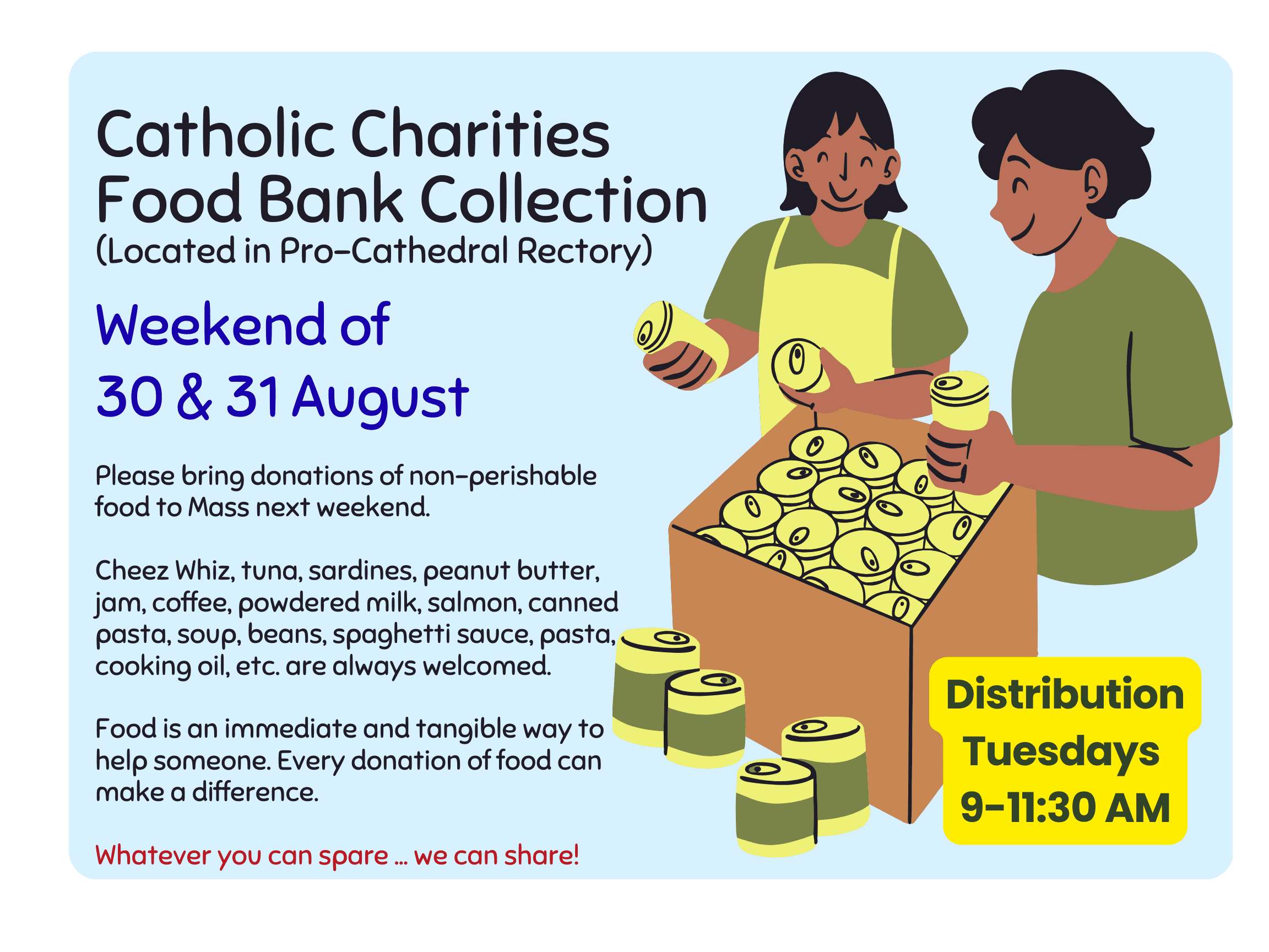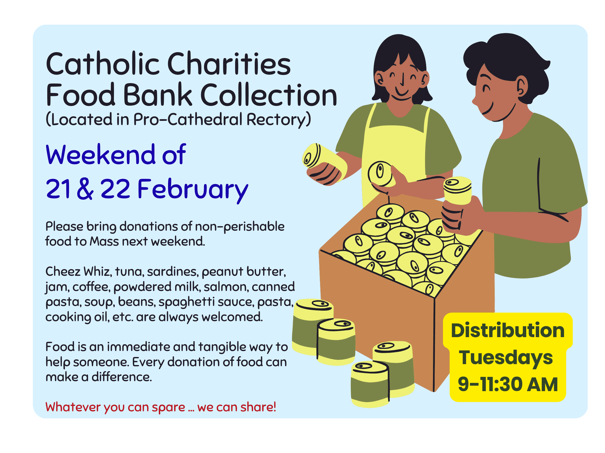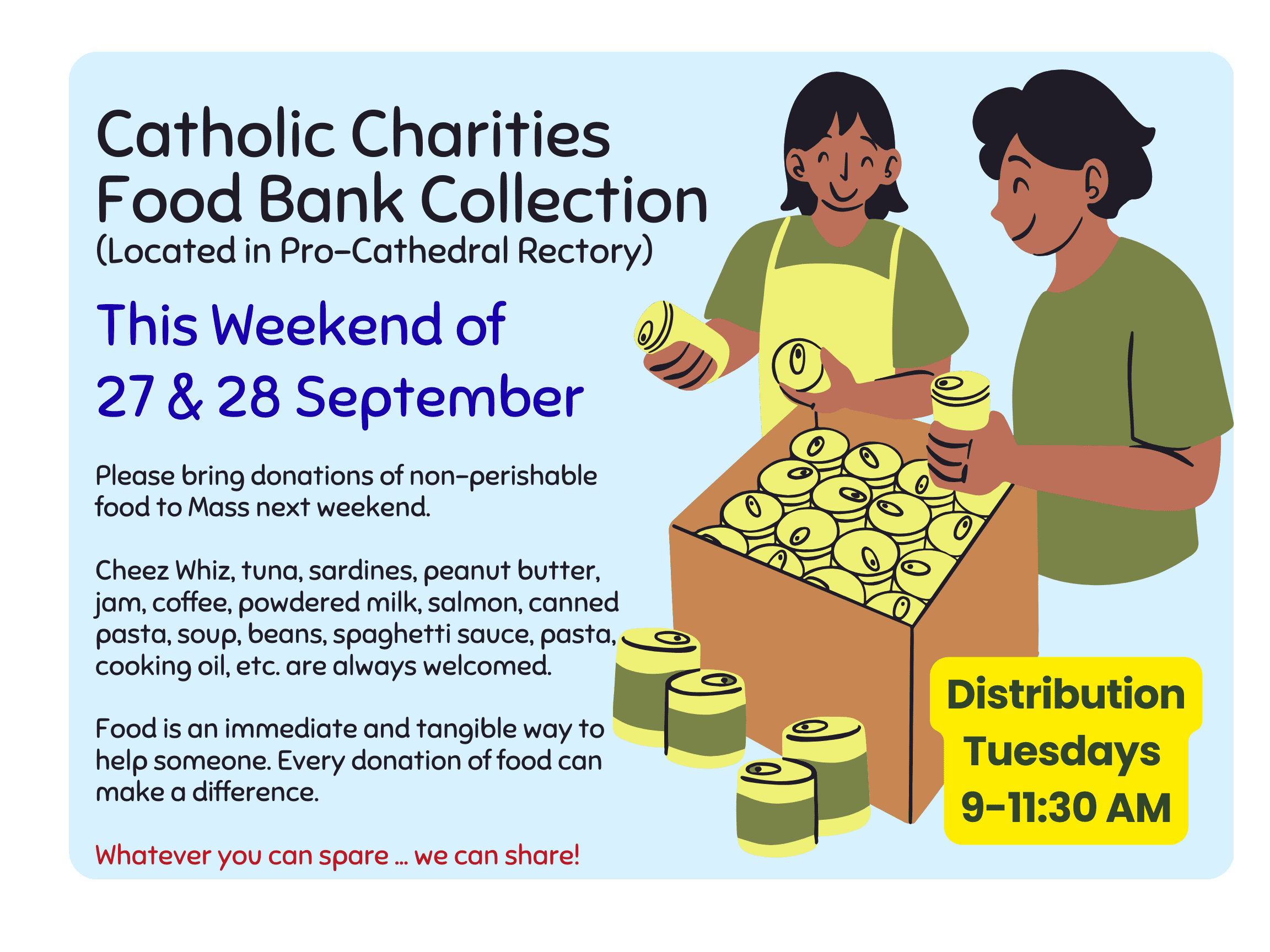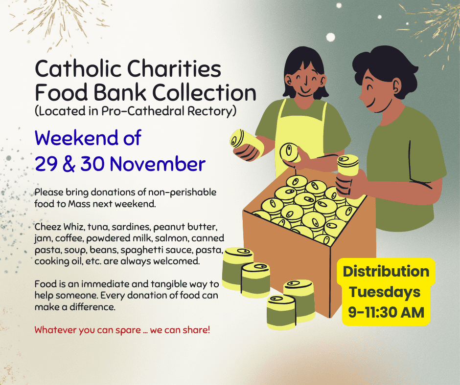 Food Bank Weekend – please bring your non-perishable food items to Mass to donate to our Catholic Charities Food Bank.