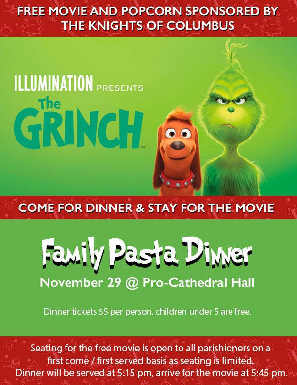 Don’t be a Grinch! Come out to our Family Pasta Dinner & Movie Night – next Saturday!
